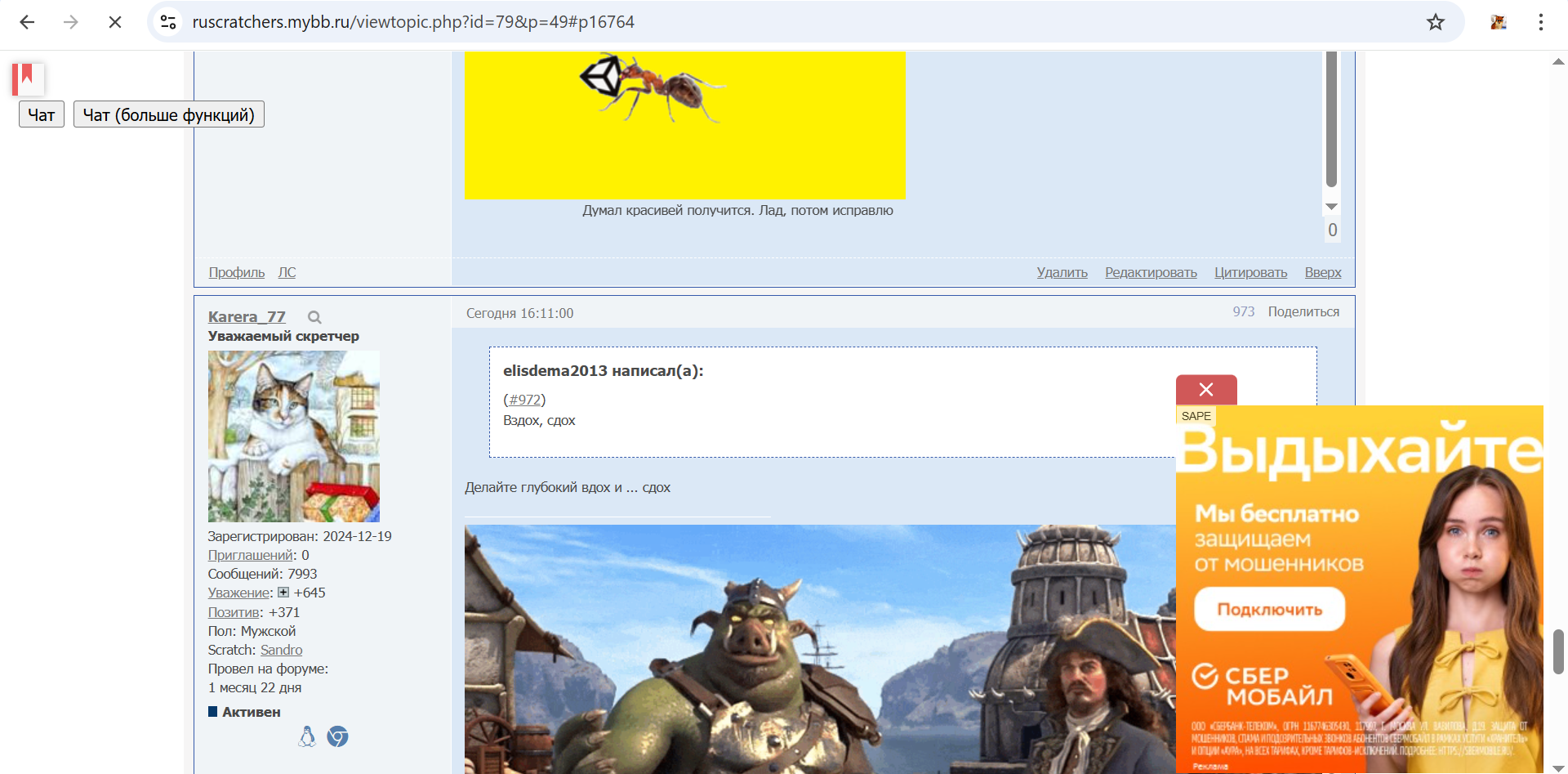 Я администратор. Я сделал очень много вещей, например кнопку чата сверху (кстати заходите, если хотите дам вам пароль от пробного аккаунта), отправку файлов (через тот чат, не удаляйте пробный аккаунт пожалуйста, иначе отправка файлов перестанет работать), тёмную тему, нормальное цитирование, выбор смайликов и многое другое.