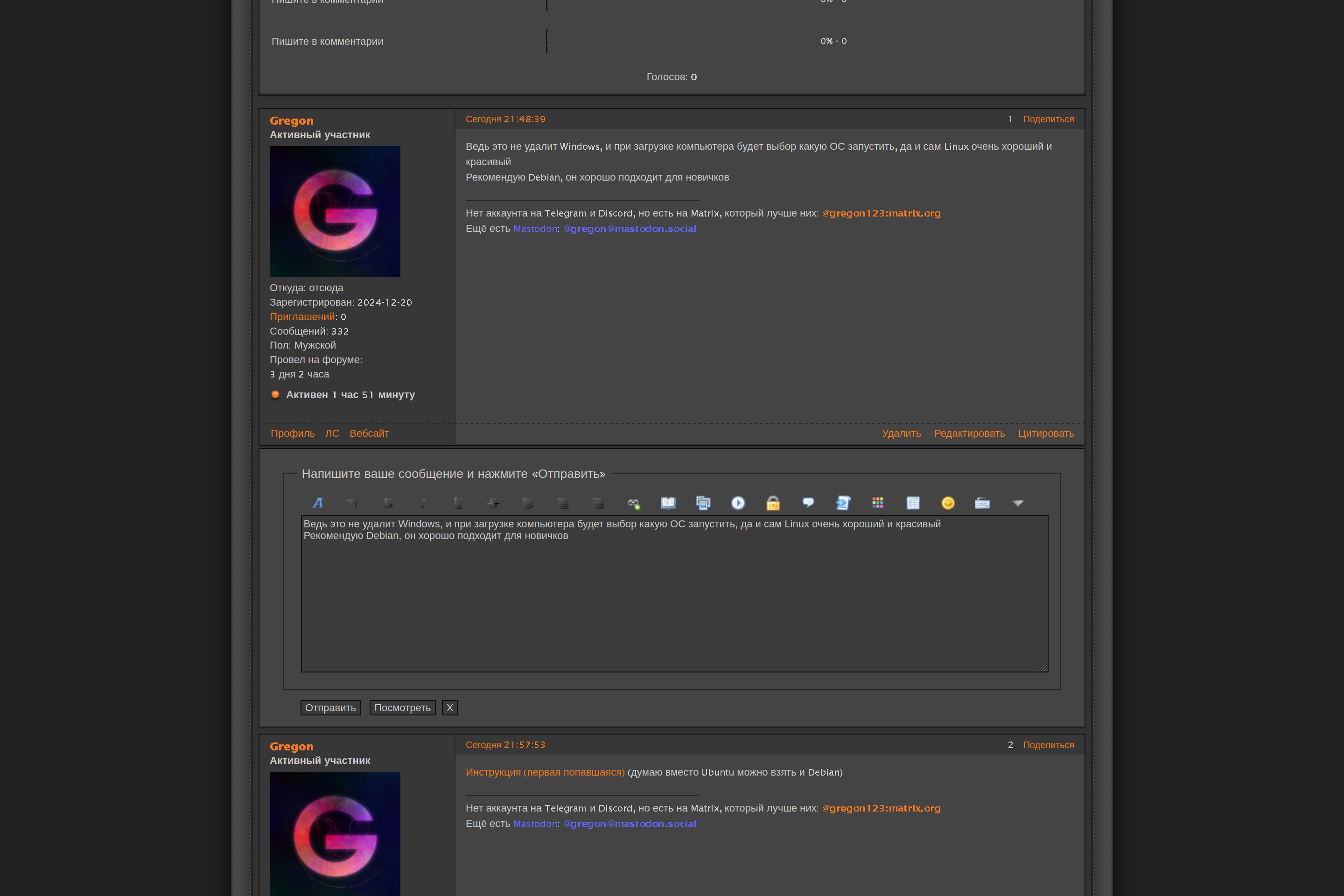 Я администратор. Я сделал очень много вещей, например кнопку чата сверху (кстати заходите, если хотите дам вам пароль от пробного аккаунта), отправку файлов (через тот чат, не удаляйте пробный аккаунт пожалуйста, иначе отправка файлов перестанет работать), тёмную тему, нормальное цитирование, выбор смайликов и многое другое.